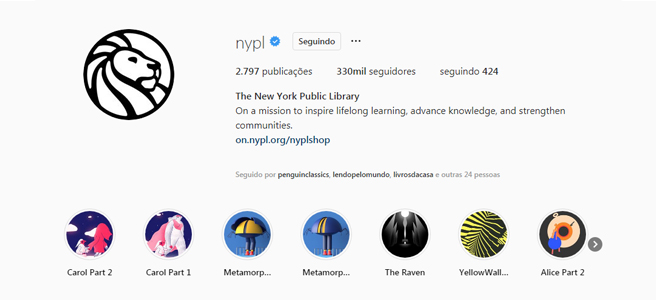 Quem também resolveu inovar no formato dos livros que disponibiliza foi, quem diria, uma instituição que já tem mais de 100 anos: a Biblioteca Pública de Nova York (New York Public Library). Fundada em 1895, ela passou a disponibilizar desde o ano passado obras que já caíram em domínio público nos Stories que ficam destacados no seu perfil no Instagram.
