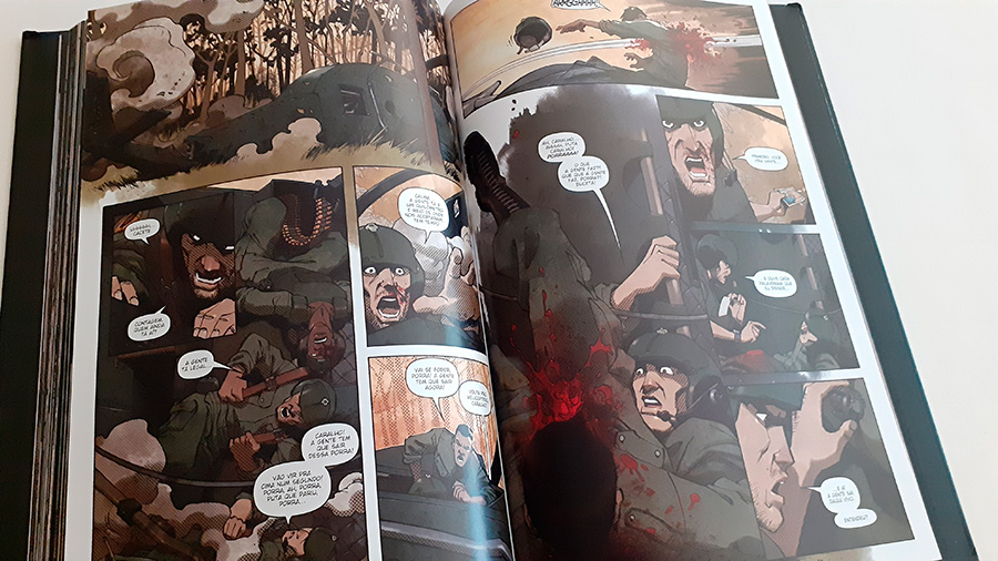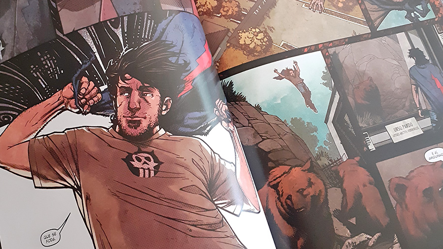 Também é interessante como nas histórias o poder se manifesta com uma necessidade de ostentação. Em determinado momento, Eric usa um urso — isso mesmo, um urso — como arma; em outro, ele ataca um avião em pleno voo usando uma serra elétrica. (A página dupla dessa cena é um dos destaques do volume, assim como a imagem assustadora que mostra o que se passa dentro da cabeça do personagem.)